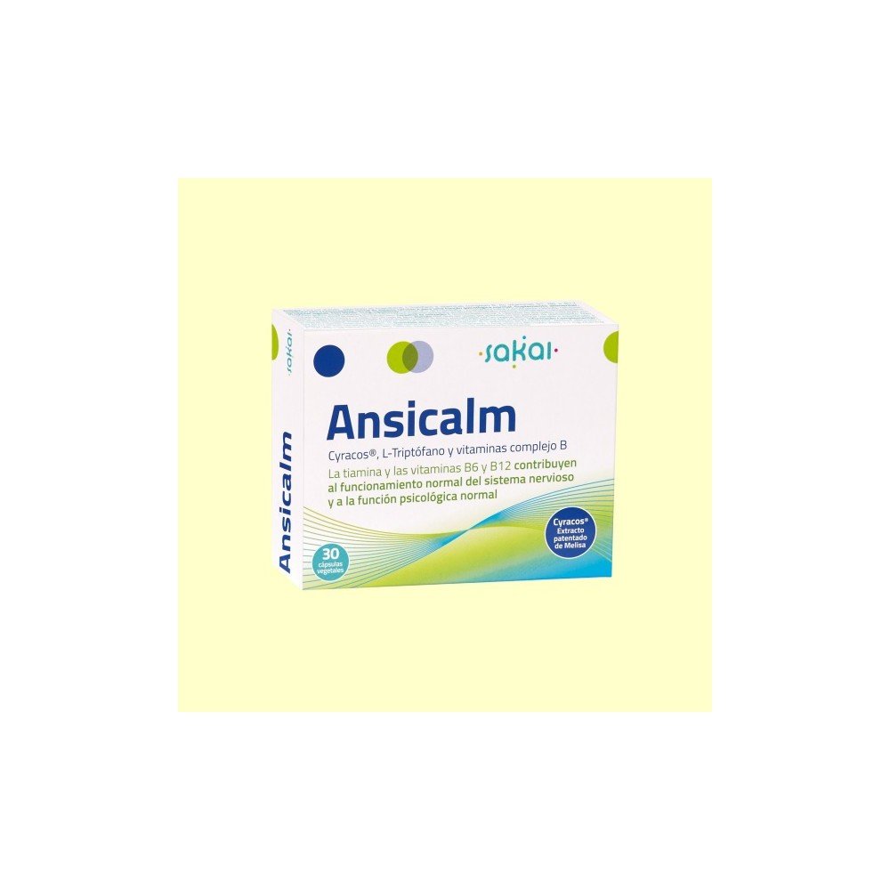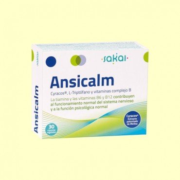 Ansicalm de Sakai es un complemento alimenticio a base de Cyracos (extracto patentado de Melisa), L-Triptófano, vitaminas B1, B6 y B12.